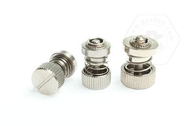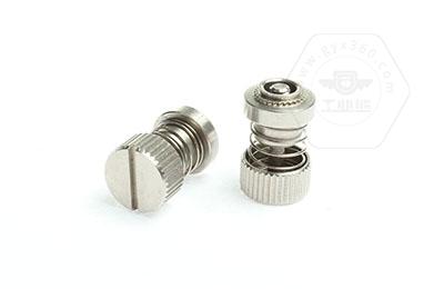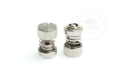 手緊螺釘?shù)膲恒T套具有壓花齒,壓裝于于機(jī)箱或薄鈑孔內(nèi)(注:薄板的鉆孔徑相對(duì)應(yīng)彈簧螺釘?shù)膲糊X徑有一定要求的,形成一個(gè)外露的彈簧螺釘,用手?jǐn)Q另一端(即手?jǐn)Q端).因其里面固定有彈簧,螺釘相對(duì)于薄板的另一端來(lái)回進(jìn)出。
