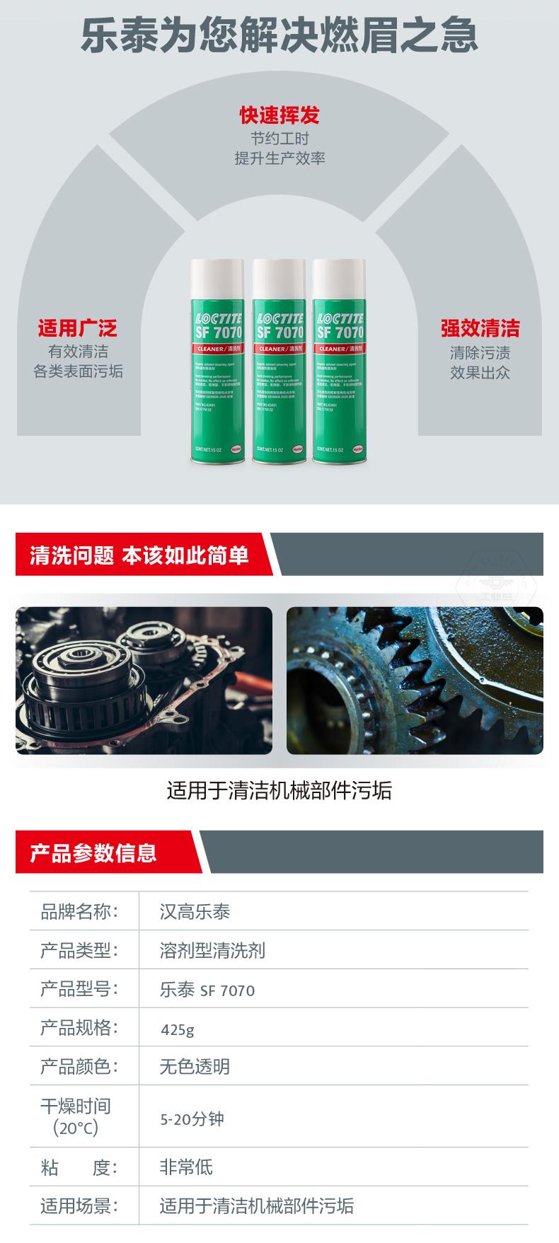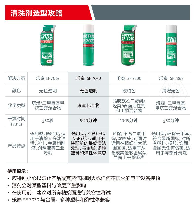 樂泰SF7070是一款溶劑型清洗劑。樂泰SF7070主打快速去污,適用于表面清潔和機(jī)械部件污垢清洗。樂泰SF7070無色透明,化學(xué)類型為碳?xì)浠衔铮?0℃下干燥時間為5-20分鐘,粘度非常低。樂泰SF7070具備快速揮發(fā)、應(yīng)用廣泛、強效清潔等特點,可用于裝配前的最終清潔處理。樂泰SF7070還與金屬、多種塑料和彈性體兼容。