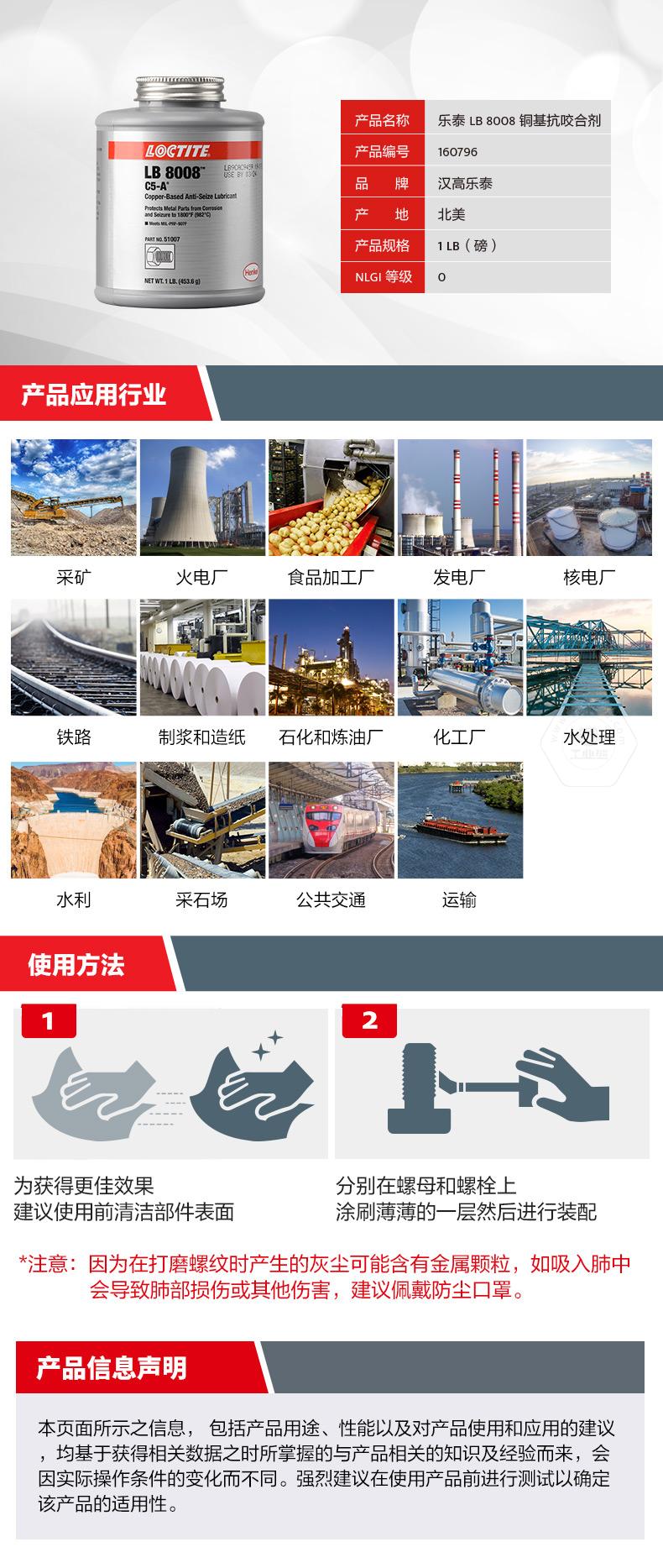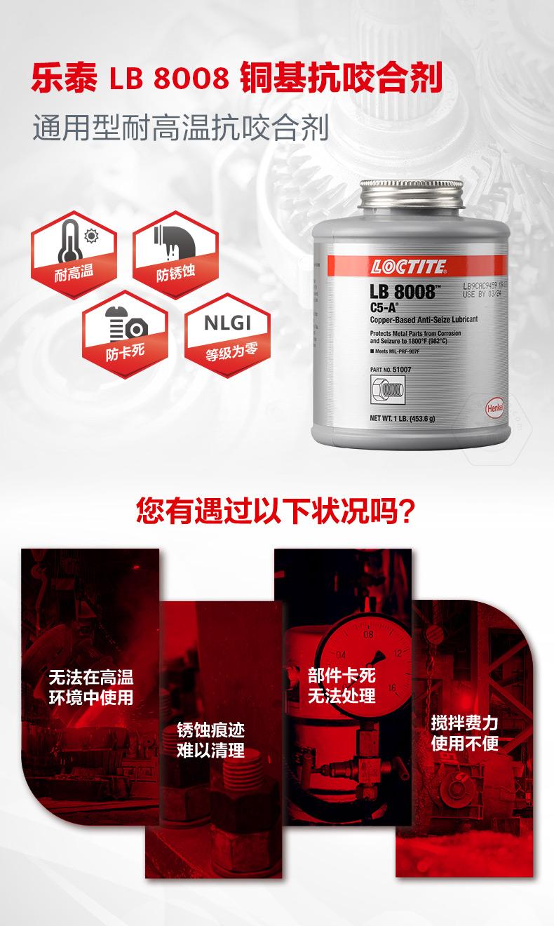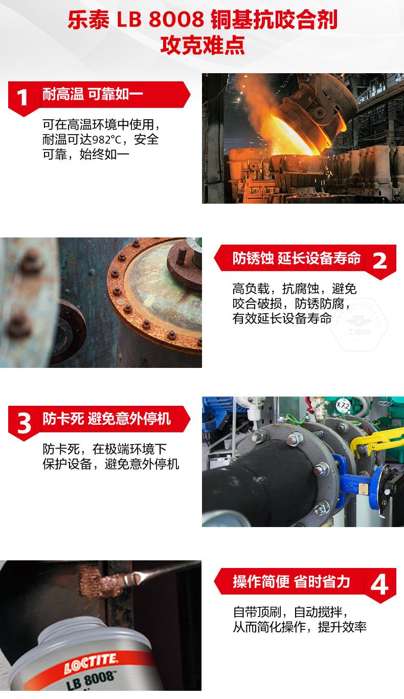 樂泰LB8008銅基抗咬合劑是一款通用型耐高溫抗咬合劑。樂泰LB8008銅基抗咬合劑耐溫可達(dá)982℃,具備防銹蝕、防卡死、NLGI等級(jí)為0等特點(diǎn)。樂泰LB8008銅基抗咬合劑適用于高負(fù)載和極端環(huán)境,可幫助避免咬合破損、延長設(shè)備壽命、減少意外停機(jī)。樂泰LB8008銅基抗咬合劑自帶頂刷并可自動(dòng)攪拌,操作更簡便,適用于采礦、發(fā)電、石化、鐵路、水處理等行業(yè)。