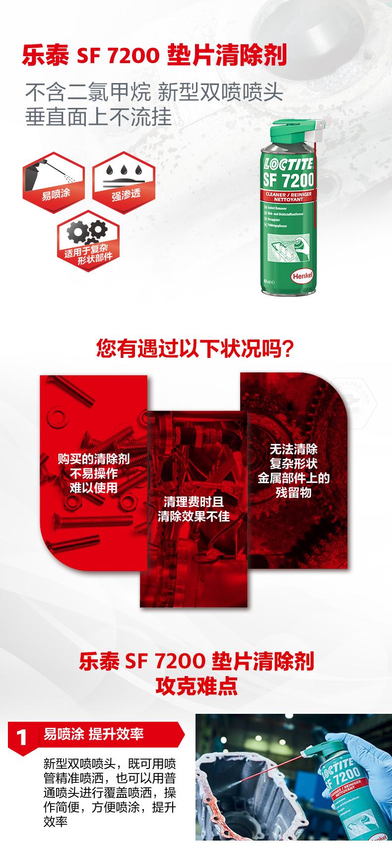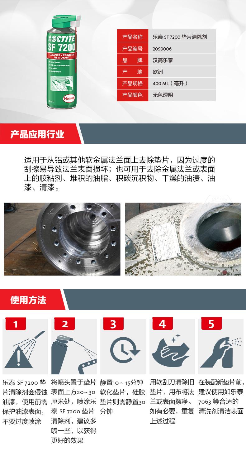 樂泰SF7200墊片清除劑主打易噴涂、強(qiáng)滲透和適用于復(fù)雜形狀部件。樂泰SF7200墊片清除劑采用新型雙噴噴頭,既可用噴管精準(zhǔn)噴灑,也可用普通噴頭覆蓋噴灑,垂直面上不流掛,操作更方便。樂泰SF7200墊片清除劑不含二氯甲烷,可快速去除污垢,節(jié)約工時(shí),降低成本。樂泰SF7200墊片清除劑適用于從鋁或其他軟金屬法蘭面上去除墊片,也可用于清除膠粘劑、油脂、積碳、干燥油漆和清漆殘留。